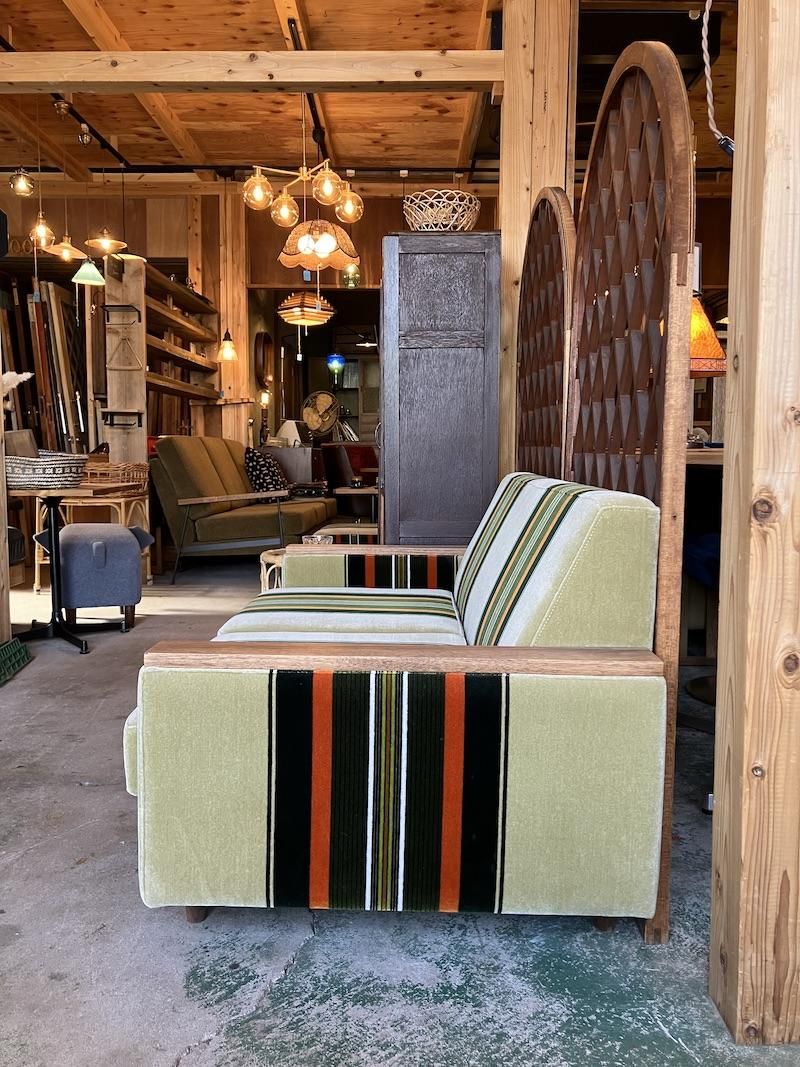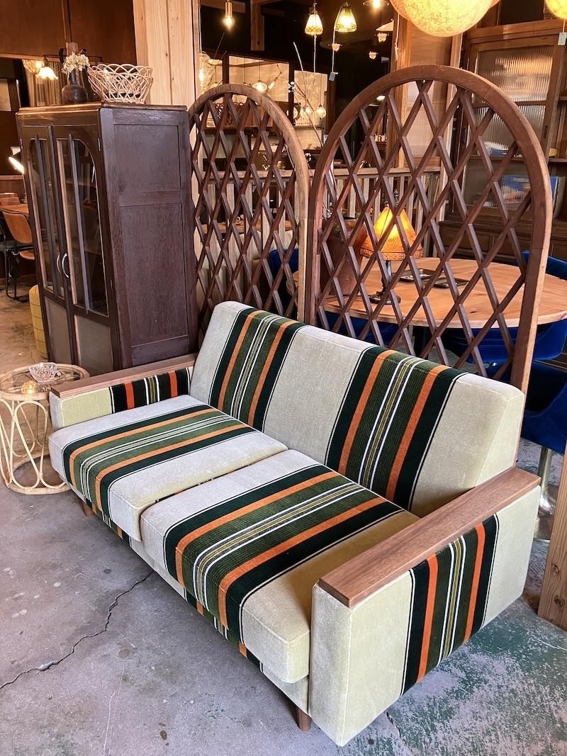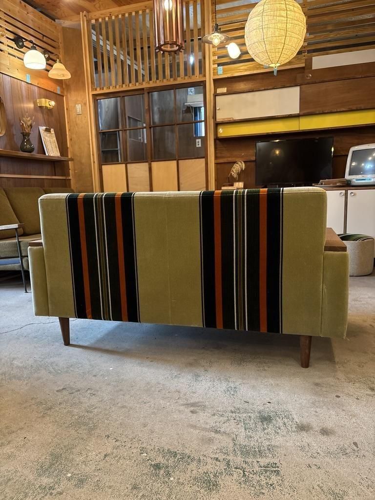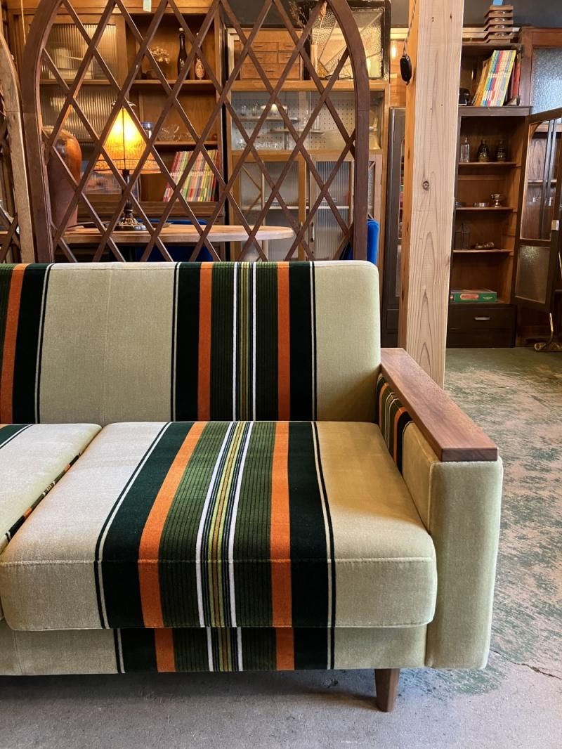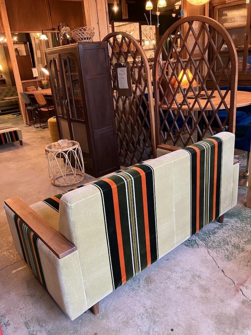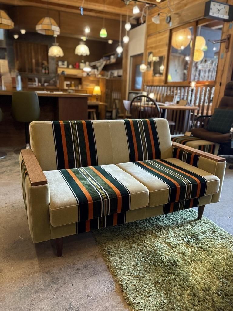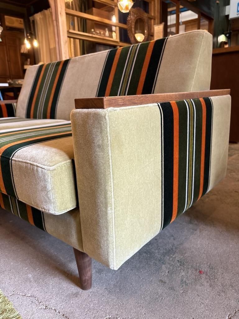 当店でしか購入できない、木ひじつきのレトロソファ。レトロテイスト満載の60年代復刻ストライプ柄モケットファブリックと木製アームがレトロ感満載のソファ。生地は少し起毛した肌触りのよいモケット地。ご注文をうけてから製造する安心の日本製です。高さが340mmと通常サイズの椅子より低く、奥行きも750mmとかなり深いのであぐらをかいたり、ゴロゴロと寝そべることができます。