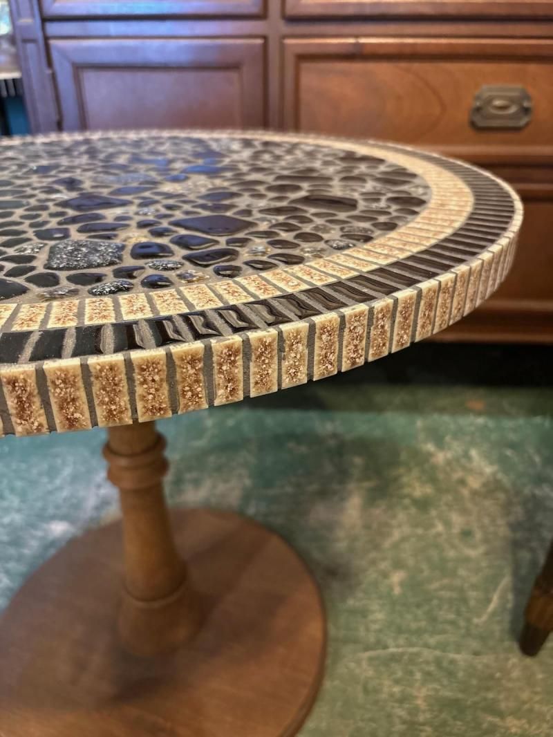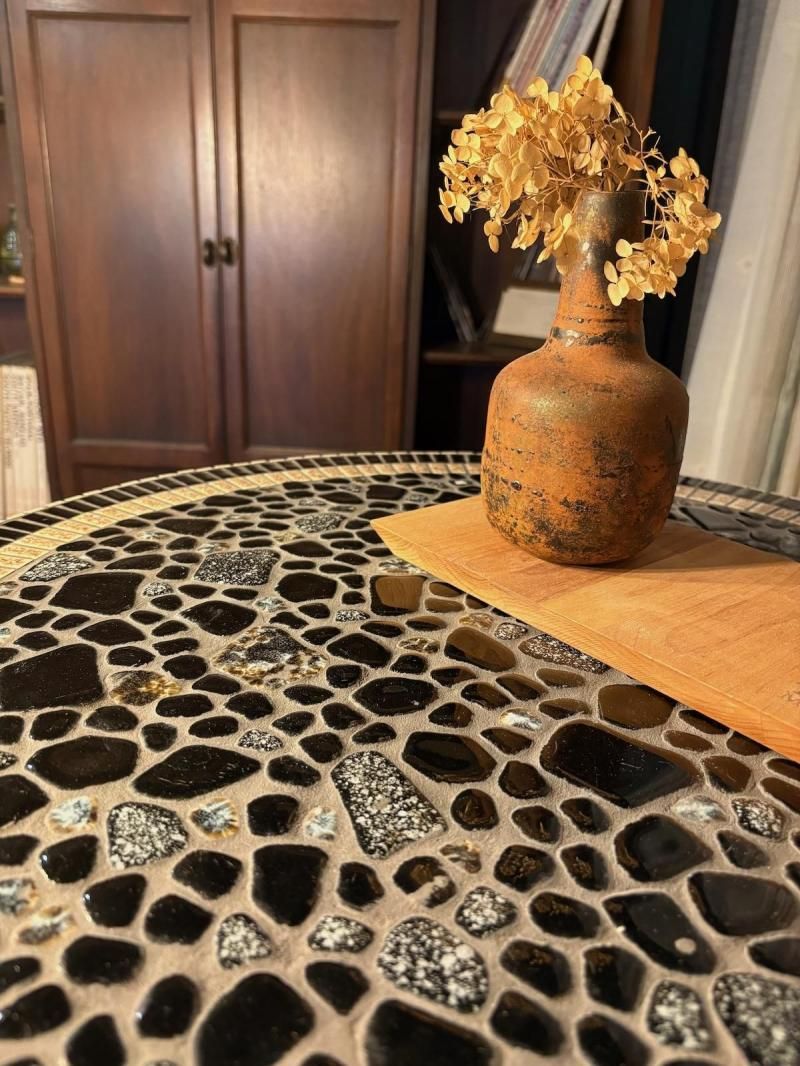 当店オリジナルタイルテーブルは、デッドストックタイルをひとつひとつ手作業で丁寧に手貼りした、まさに一点ものの逸品です。ラウンドテーブルの天板には、タイルが美しい円を描き、ユニークかつ個性的な雰囲気を演出します。