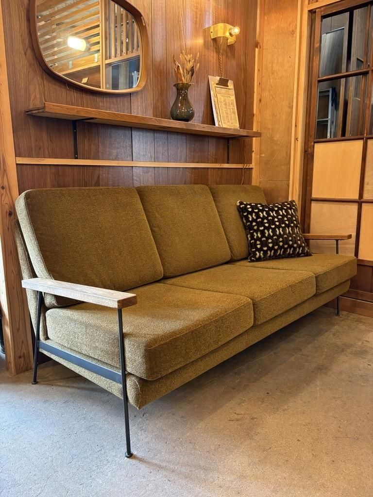 細目のアイアンをフレームに使い、ストレートフォルムのビンテージデザインが特徴。背もたれは高く、首も預けられるしっかりとしたサポート感があります。さらに、オーク無垢材の手すり付きで、腕もゆっくり預けることができ長時間座っても疲れにくいリラックスできるソファです。